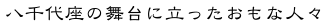 | 八千代座公演の歴史は、明治、大正、昭和時代の芸能の歴史を反映しています。こけら落しの歌舞伎から始まり、活動写真(映画)も盛んで、大正になると浪曲(浪花節)が多くなりました。また、6年に来演した芸術座トルストイの「復活」は山鹿の人々に強い印象をあたえました。松井須磨子が劇中で歌ったカチューシャの歌は山鹿中で歌われたくらいに大流行したそうです。少女歌舞伎も大人気でした。昭和になると、演説会、新派劇と様々。珍しいものでは映画と劇を一緒にした連鎖劇も出てきます。変わったところでは、柔道、相撲、ボクシングの試合もありました。戦後は、福岡フィルや辻久子のバイオリンリサイタル、谷桃子のバレエ,淡谷のり子、東京混声合唱団など新しい音楽のジャンルも登場してきます。昭和30年代は映画が主流になりますが、その映画もテレビに押され、八千代座も施設の遅れもありだんだんと敬遠されるようになりました。娯楽の変遷は厳しいものがありました。そして八千代座は40年代後半まで、時々の利用はあったようですが、経営不振により閉鎖されてしまいました。平成2年八千代座復興を願う一人の女性が八千代座の資料を玉三郎さんに送ったのがきっかけで「坂東玉三郎舞踊公演」が八千代座で続けられています。 | |||||||||||||||||||||||||||||||||||||||||||||||||||||||||||||||||||||||||||||||||||||||||||||||||||||||||||||||
